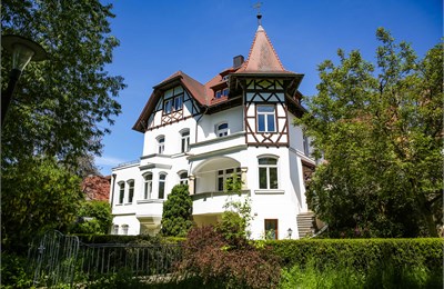 A modern, open Loft, primary constructed from light wood, with a roof terrace and a view of the mountains.