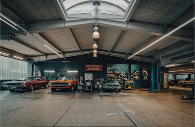 Workshop hall housing various businesses, including a large classic car restoration workshop. Additionally, an underground parking garage and a vault with parking spaces. Small bar with seating.