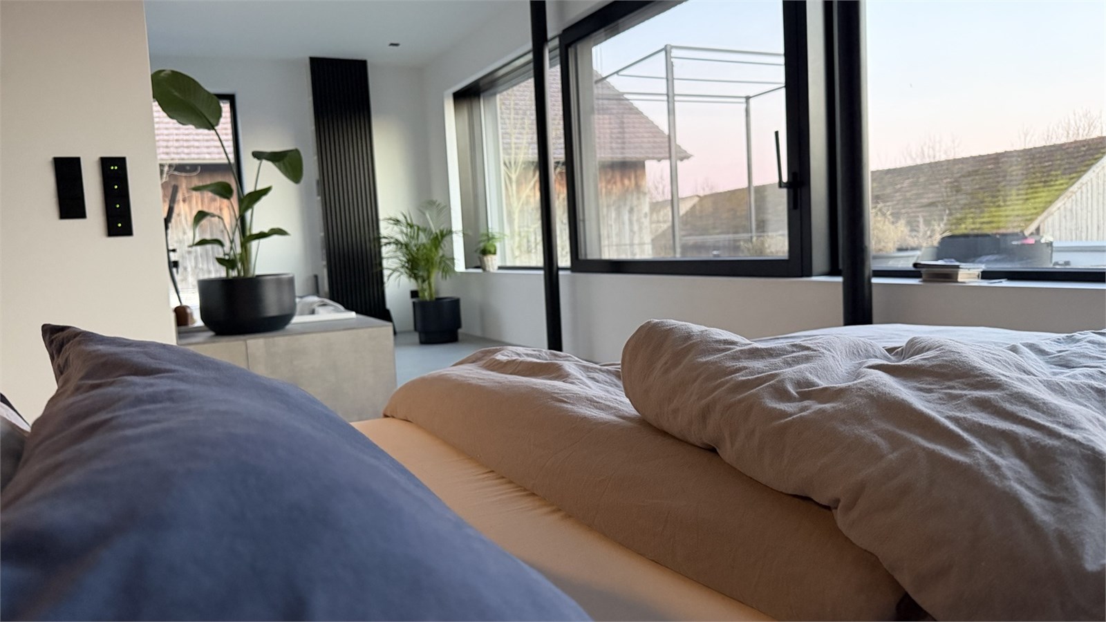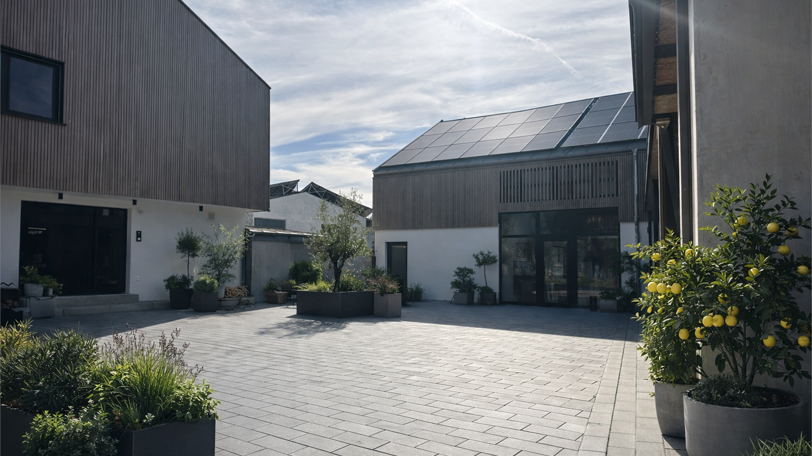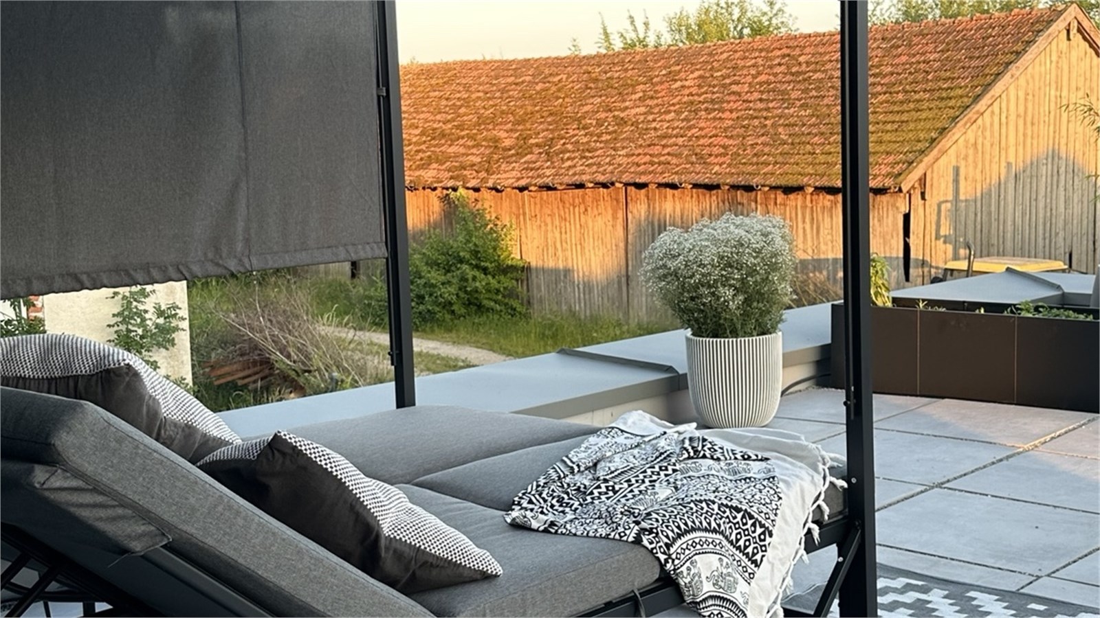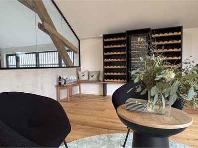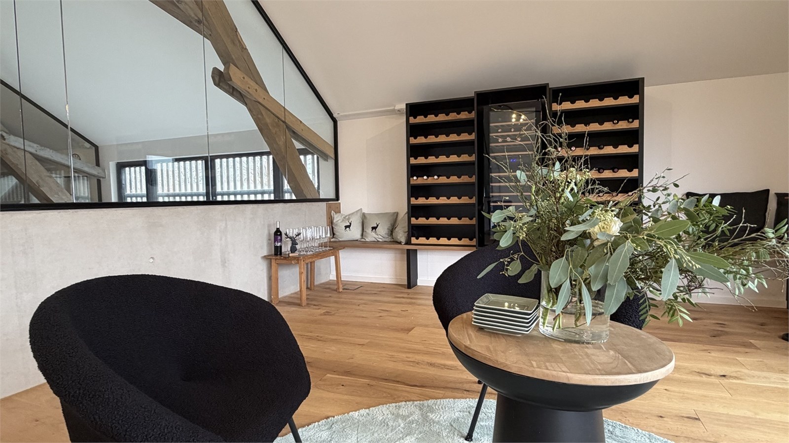 Nestled in a rural region characterised by agriculture and the automotive industry, the Dannerhof estate presents itself as a harmonious blend of tradition and contemporary architecture. The former farmstead has been sensitively renovated and rebuilt, and today combines its historic character with modern living and functional design. The complex comprises: a spacious barn, which can be booked for corporate and private events for up to 70 people, as well as for photo and film shoots; a modern detached house with a pool; and two self-sufficient tiny houses. The barn forms the heart of the estate. With an open roof structure, exposed wooden beams and generous ceiling heights, it combines rural authenticity with modern clarity. Large openings allow plenty of natural light into the space, creating a warm, natural ambience. The barn’s floor plan is clearly and openly structured. The central area forms a spacious main room without fixed partitions. The two tiny houses complement the ensemble as self-contained, self-sufficient retreats. Despite their compact size of 34 m², they offer a full sense of space thanks to intelligent planning. Large windows create brightness and connect the minimalist interior with the surrounding nature. The privately occupied detached house combines modern living with the character of the original farmstead.