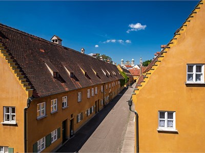 The Fuggerei is the oldest existing social settlement in the world, a city within the city with 67 houses and 142 apartments and its own church. It was built in the year 1521.