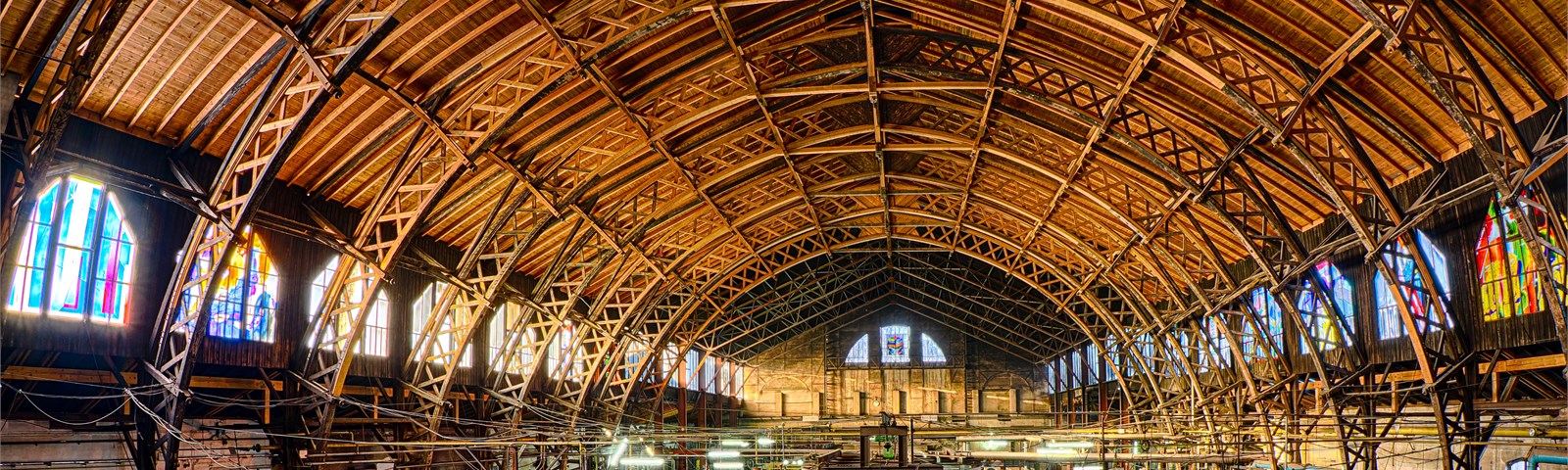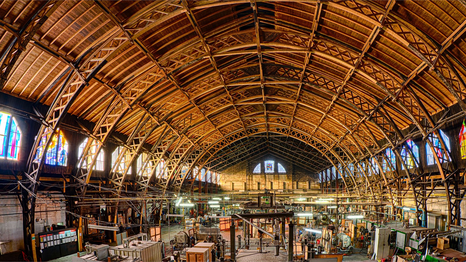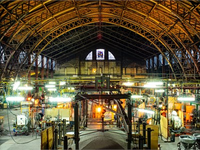 The historical kiln hall at Glashütte Lamberts was built in 1906/1907 and features a wooden roof construction dating back to 1896. Mouth-blown glass is still manufactured here to this day. The hall itself is 18 metres high, 28 metres wide and approx. 70 metres long. The kiln hall sits in expansive factory grounds, which are also home to a number of warehouses.