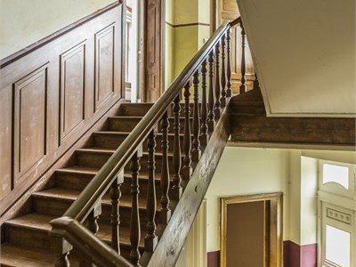 The “Höppner House” was constructed exclusively as a full set for the series “Die Unzertrennlichen” in 1996/1997. It is divided between the ground floor, upper floor, and attic with a total area of approx. 500 square meters, length approx. 27 meters, depth approx. 7 meters, and height 15 meters. The upper floors can be accessed by means of a spacious staircase. Particularly worthy of mention are the luxurious furnishings of the rooms, with wall profiles and all-around stucco. The rooms can be uniformly painted or wallpapered as required by the production, while the open ceilings provide space for setting up spotlights. A large bathroom is located on the upper floor, with functioning water supply on request.