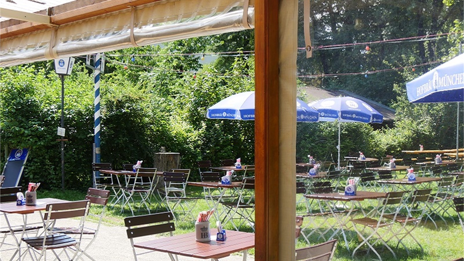 Biergarten with mountain hut, small playground and covered sun terrace in Untergiesing, Munich. Quiet, leafy location on the water meadows of the Isar, far from any street noise. The room in the mountain hut can be decorated as wished.