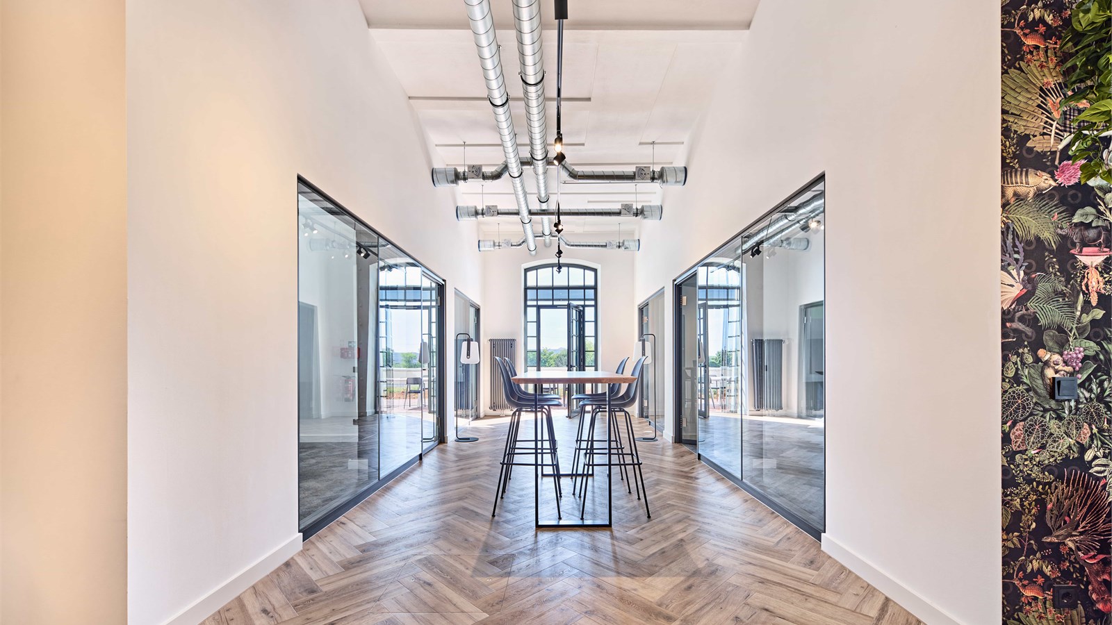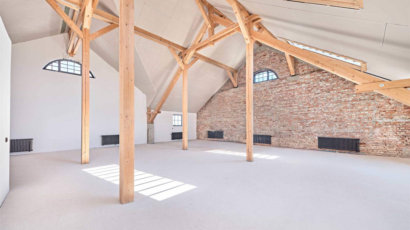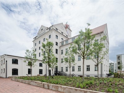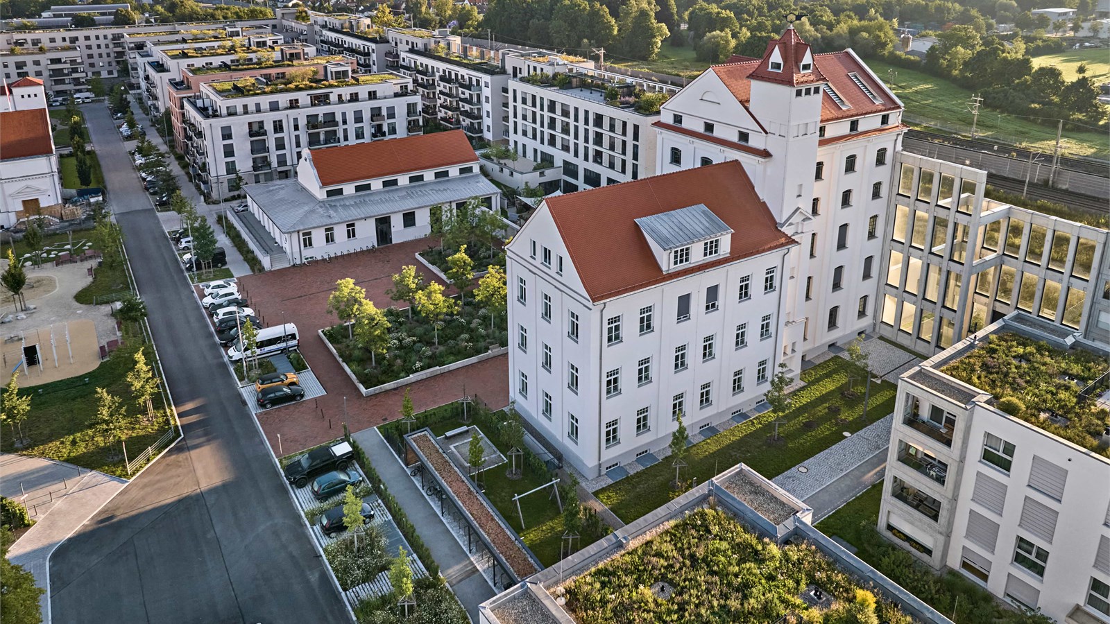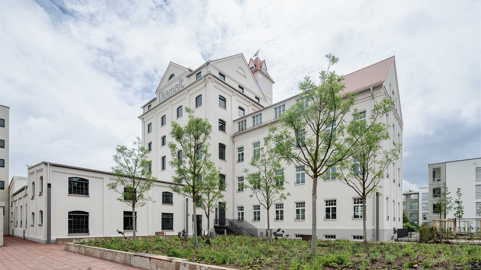 A listed, revitalized, historic, and central building, formerly a soup seasoning factory and workshop, on the grounds of the former Diamalt factory in Allach. Here, history meets modernity. Where malt candies and soup seasoning were once produced, modern loft offices with an industrial look now stand alongside newly built employee apartments and a daycare center. Construction year 2019-2024; Listed building, Industrial, Office, Coworking