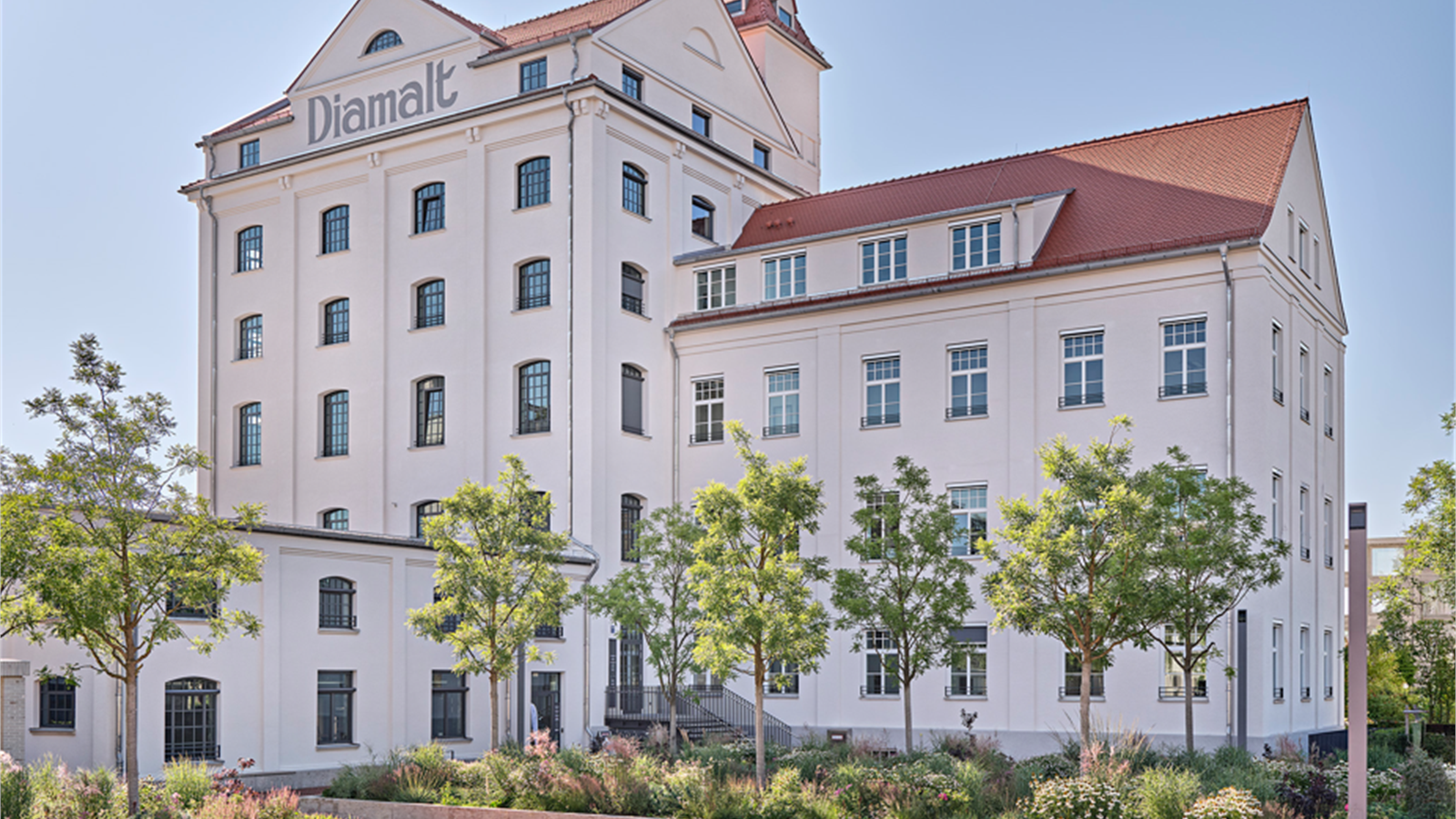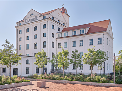 A listed, revitalized, historic, and central building, formerly a soup seasoning factory and workshop, on the grounds of the former Diamalt factory in Allach. Here, history meets modernity. Where malt candies and soup seasoning were once produced, modern loft offices with an industrial look now stand alongside newly built employee apartments and a daycare center. Construction year 2019-2024; Listed building, Industrial, Office, Coworking