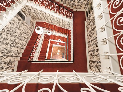 The MOMA1890 Boutique Hotel in Munich is a successful blend of history and contemporary design. The hotel is housed in a restored 19th century building in a central downtown location. The location exudes an elegant atmosphere characterized by artistic details and carefully selected furnishings. Keywords: Hotel, Munich, city, staircase, architecture, design, train station