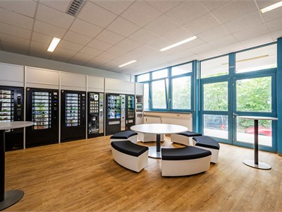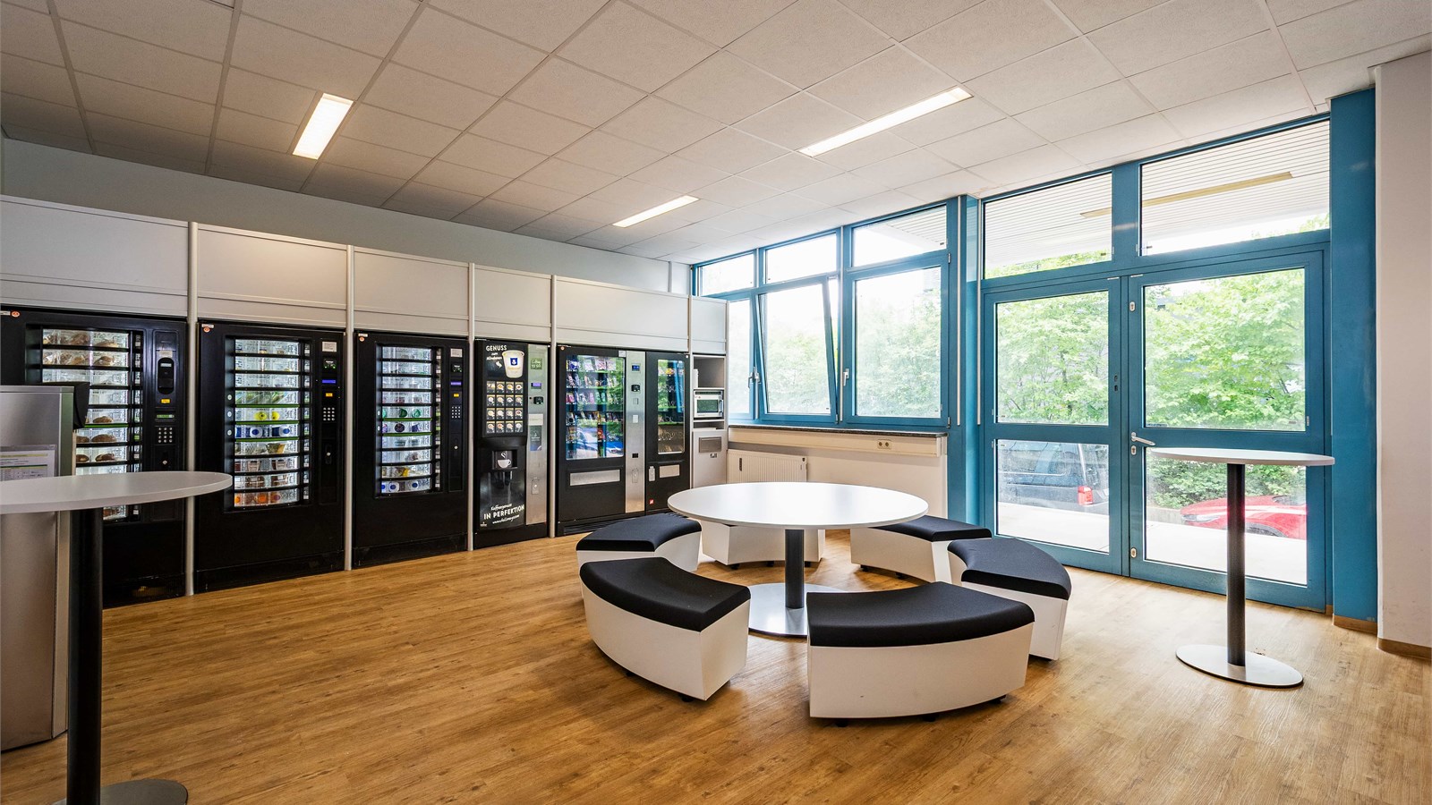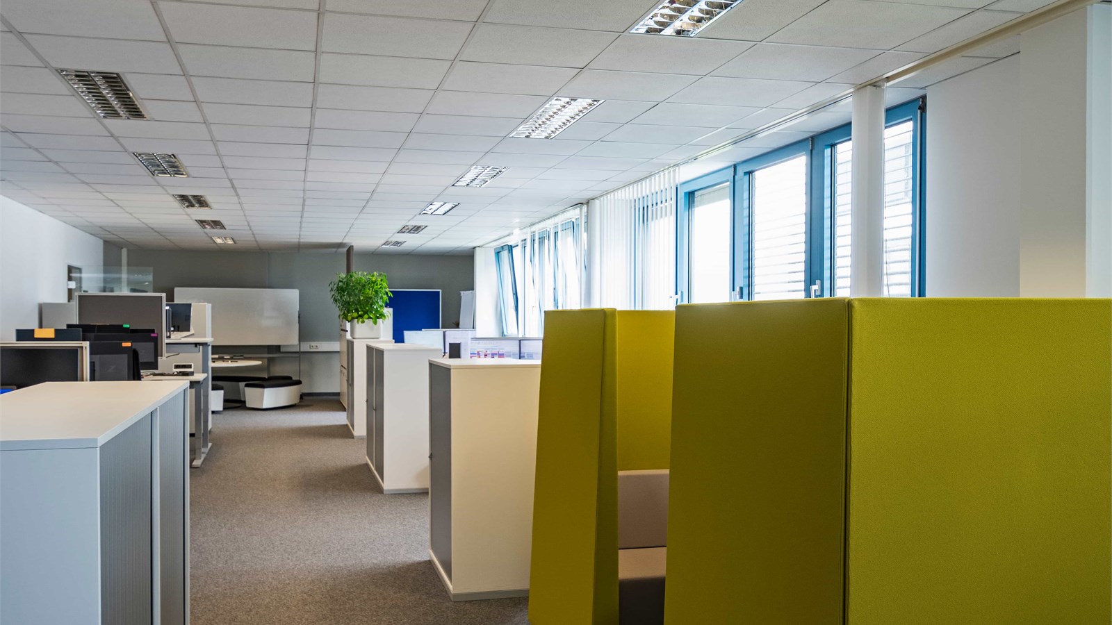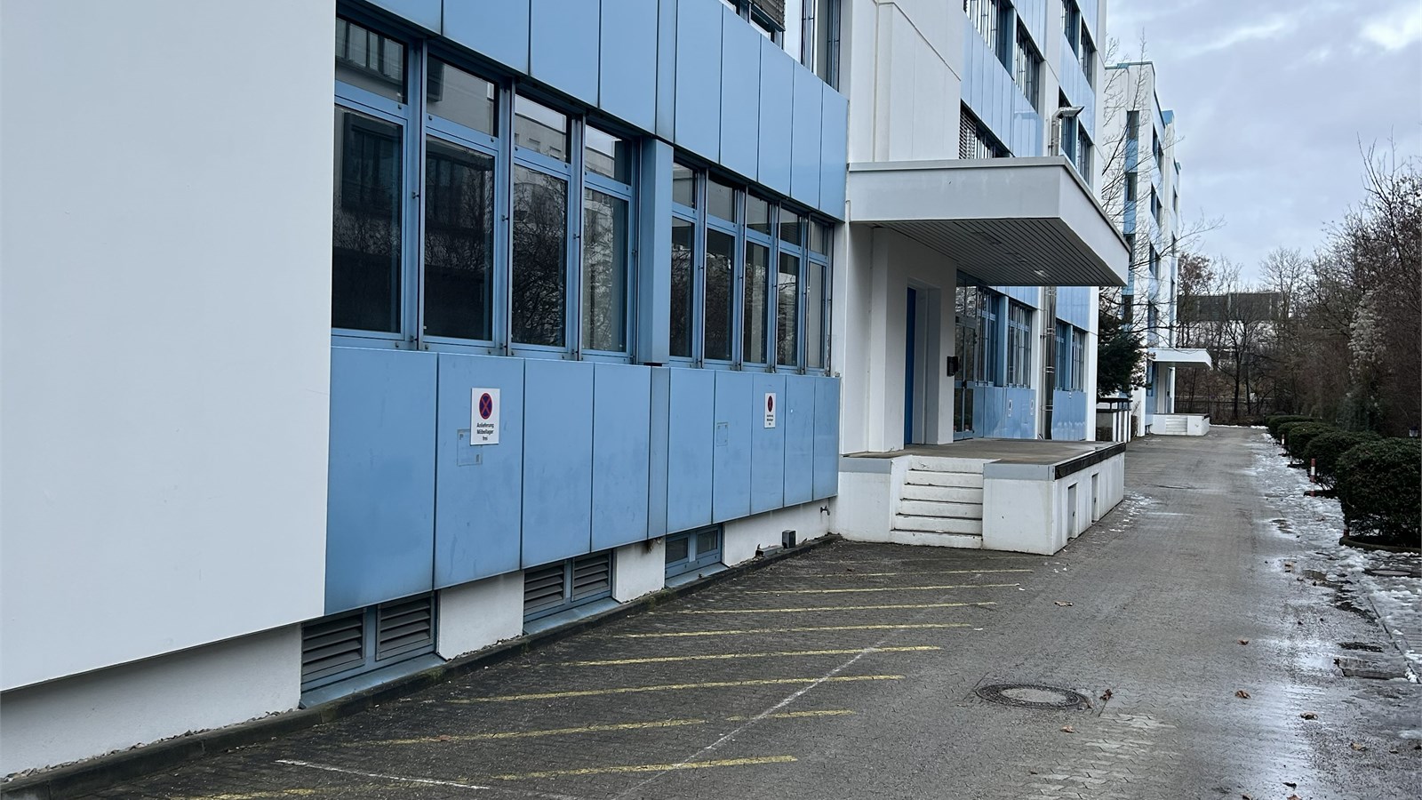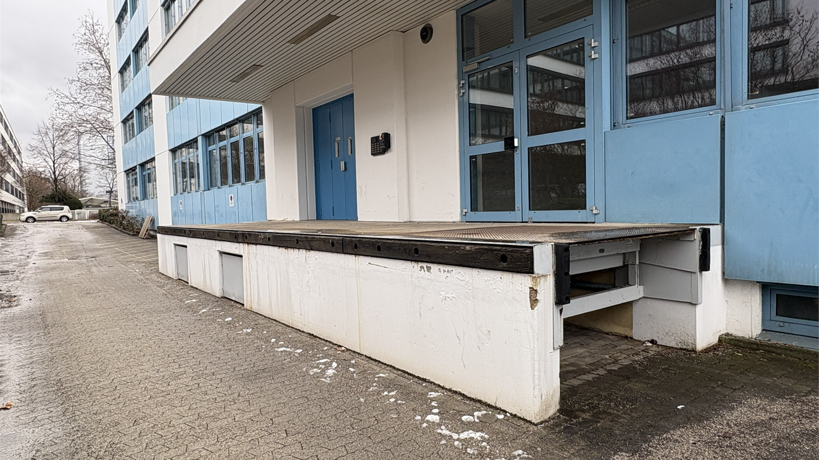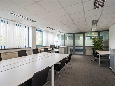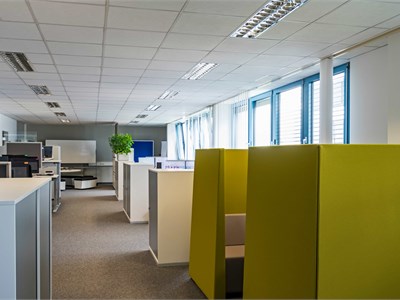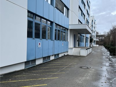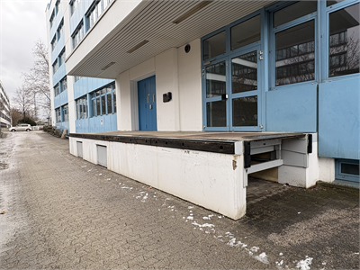 Office building from 1992 in an industrial park in northern Munich, two structures with ground floor to 4th floor, blue and white facade. Taunusstr. 27 with approximately 8,124.20 sq m and approximately 1,350 sq m per floor, Taunusstr. 29 with approximately 4,742.12 sq m and approximately 790 sq m per floor. Inside, open-plan offices with needle-felt carpeting, which were in use until recently. Each building has a truck access ramp at the rear, as well as freight elevators. Unfurnished. The spaces are in good used condition with suspended ceilings and are bright due to large windows. Parking is available in front of the building, with truck access around the perimeter and an underground parking garage.