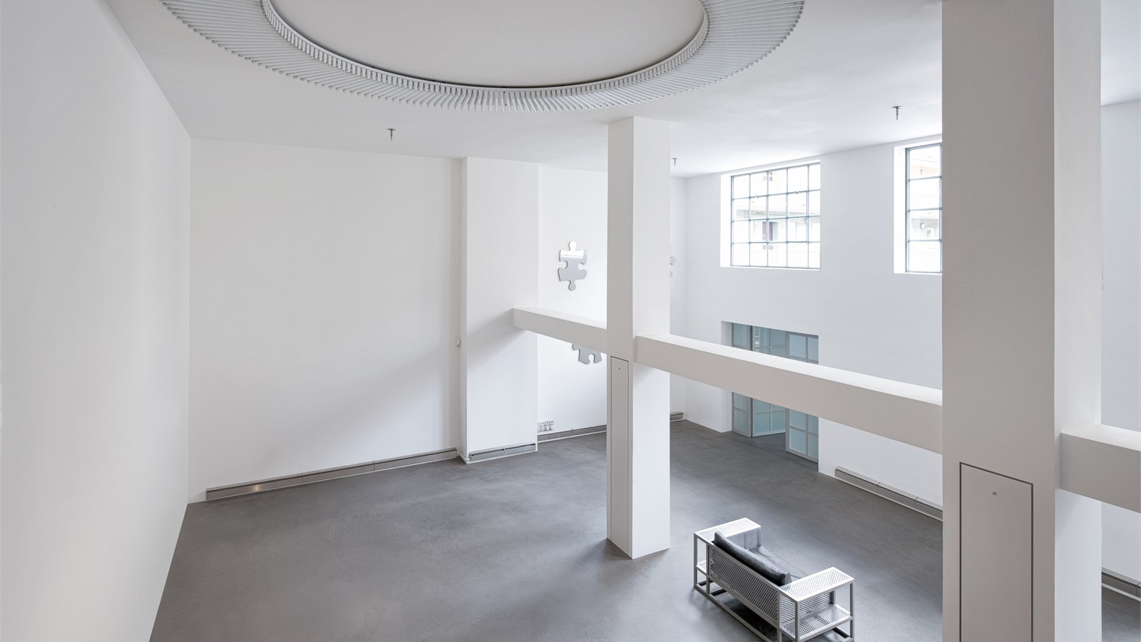 Centrally located in Munich-Schwabing, the art gallery offers ideal conditions for film productions. Spacious studio windows, plenty of daylight, and high ceilings characterize the rooms. The centerpiece is an approx. 120 m² gallery space with a ceiling height of around 5 meters and a gallery that offers special perspectives for photo and video shoots. The location is complemented by several adjoining rooms, a private driveway to the separate rear building, and an enclosed courtyard that offers additional filming opportunities and logistical advantages. Built in the 1950s, extensive conversion and renovation work carried out in 2008. Bauhaus architecture, studio, gallery, rear building, loft, courtyard.