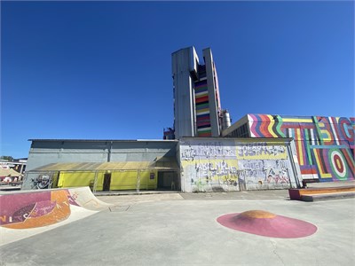 On the grounds of the former Katzenberger concrete plant, Sugar Mountain offers a diverse cultural program as well as a wide variety of sports facilities. The outdoor areas include a basketball court, a skate park, a soccer field, a bike park and a beer garden. In addition, the site includes a spectacular hall, office buildings, etc. 7500 square meters of outdoor space. 2000 square meters of indoor space - currently the temporary use is limited until the end of 2023.